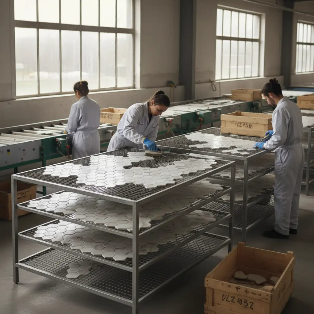 Pickup of tile waste from site demolition or retail damage. Crushed and sized into terrazzo-grade aggregate for reuse in our recycled terrazzo tile line.