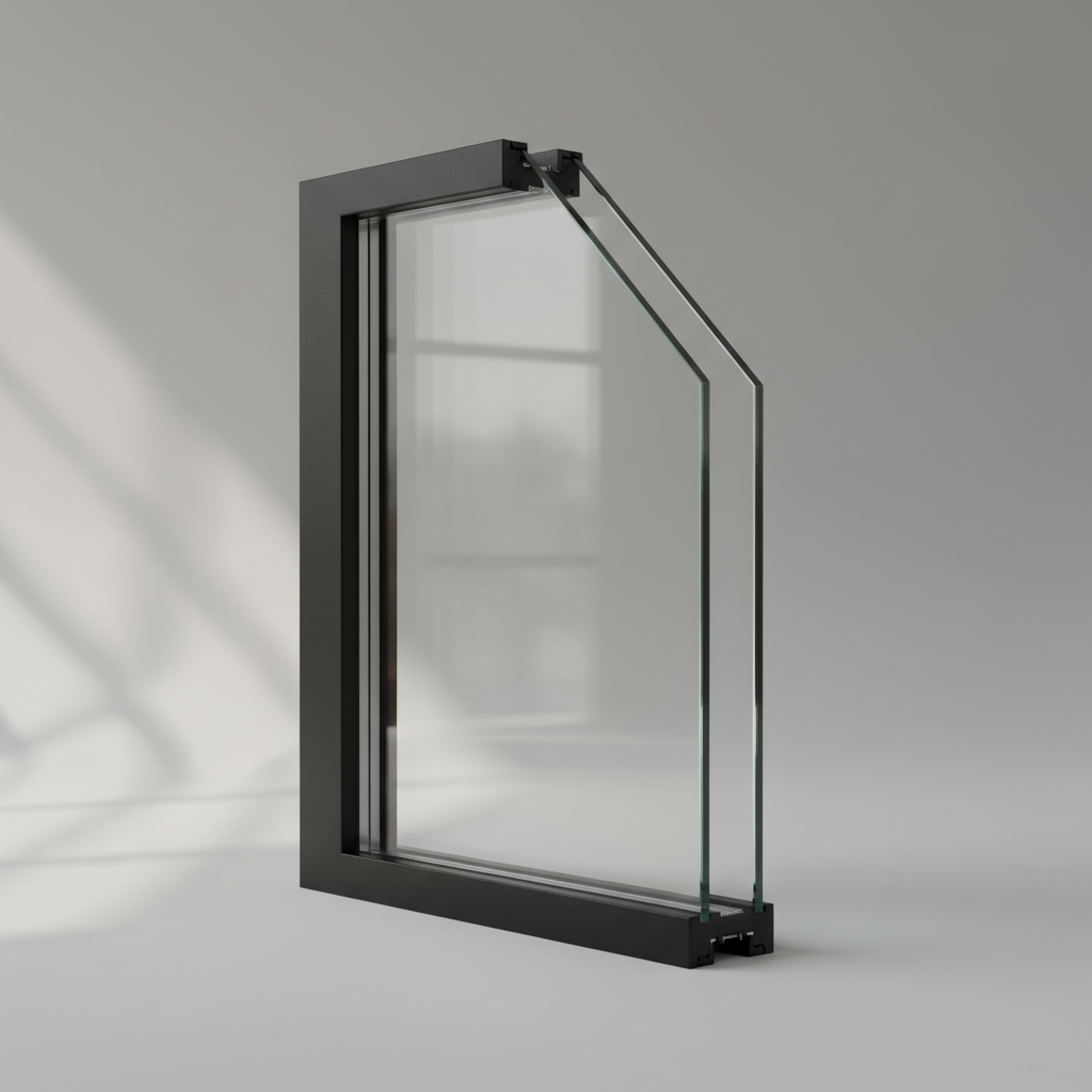 Double-glazed insulated glass unit — two panes with argon-filled cavity and thermal spacer. Significantly reduces heat transfer compared to single glazing.